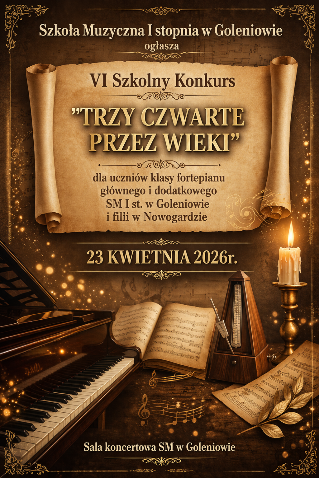 Uroczystość pasowania na ucznia Szkoły Muzycznej I stopnia w Goleniowie, odbędzie się dnia 16 października 2024 roku o godzinie 17.00.